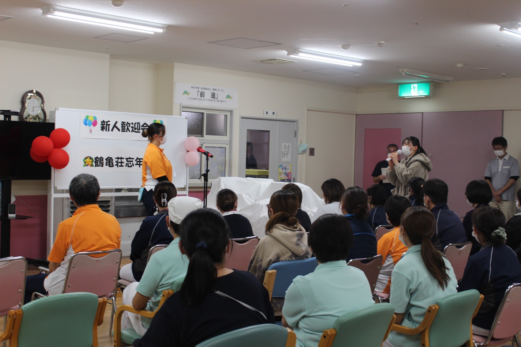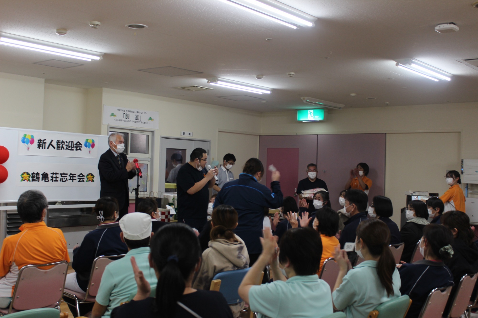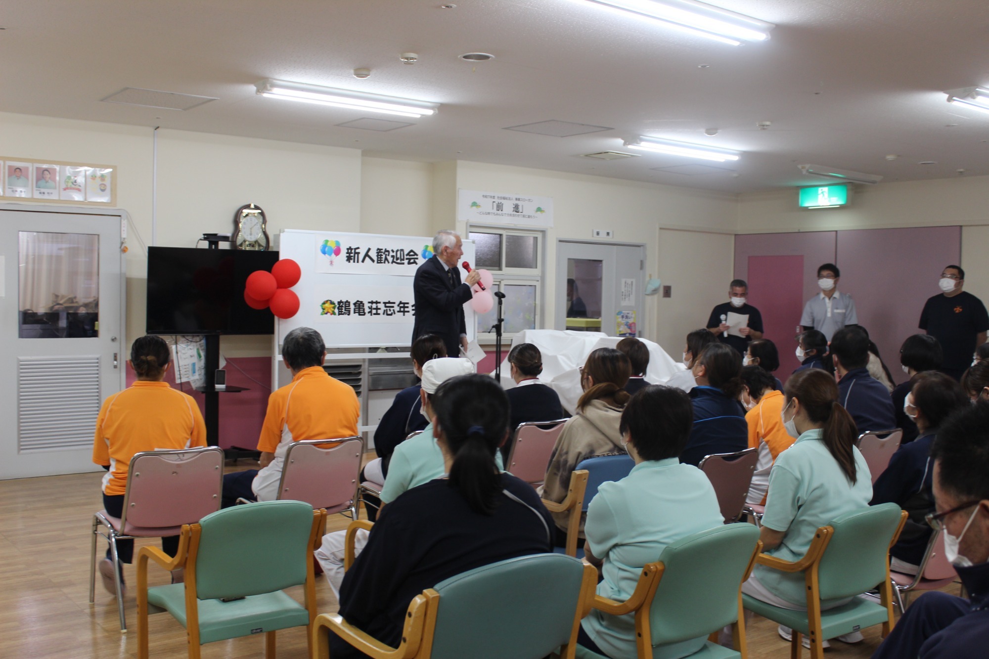 今年度も施設内で新人職員歓迎会および忘年会を開催しました。 理事長より「今年も感染症などの予防から行事も小規模での開催となりますが、一緒に楽しみましょう。そしてこれからも職員の国籍・年齢関係なくみんながチーム鶴亀となって邁進していきましょう」とのあいさつがありました。