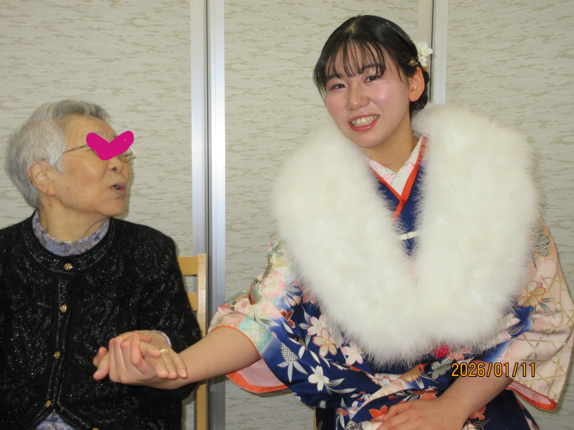 祝う会の後には、グループホーム鶴亀の入居者様に振袖姿をお披露目するために遊びに来てくれました。
