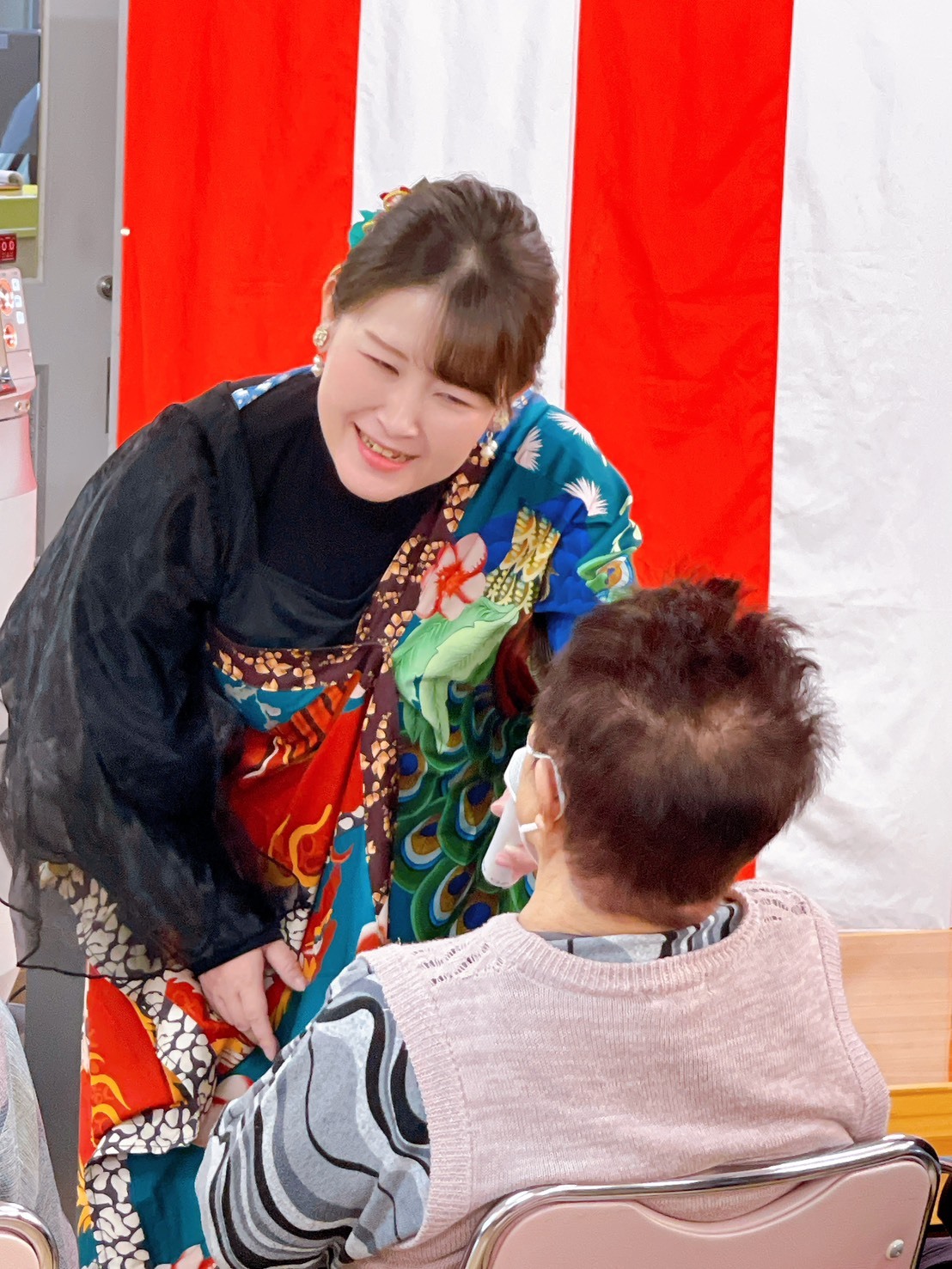 ショーの後半には、懐かしの昭和メドレーに合わせて、入所者・利用者様との交流を図ってくださいました。一人ひとりと笑顔で向き合い、美しい歌声をご披露いただき、みなさまから笑みがあふれておりました。