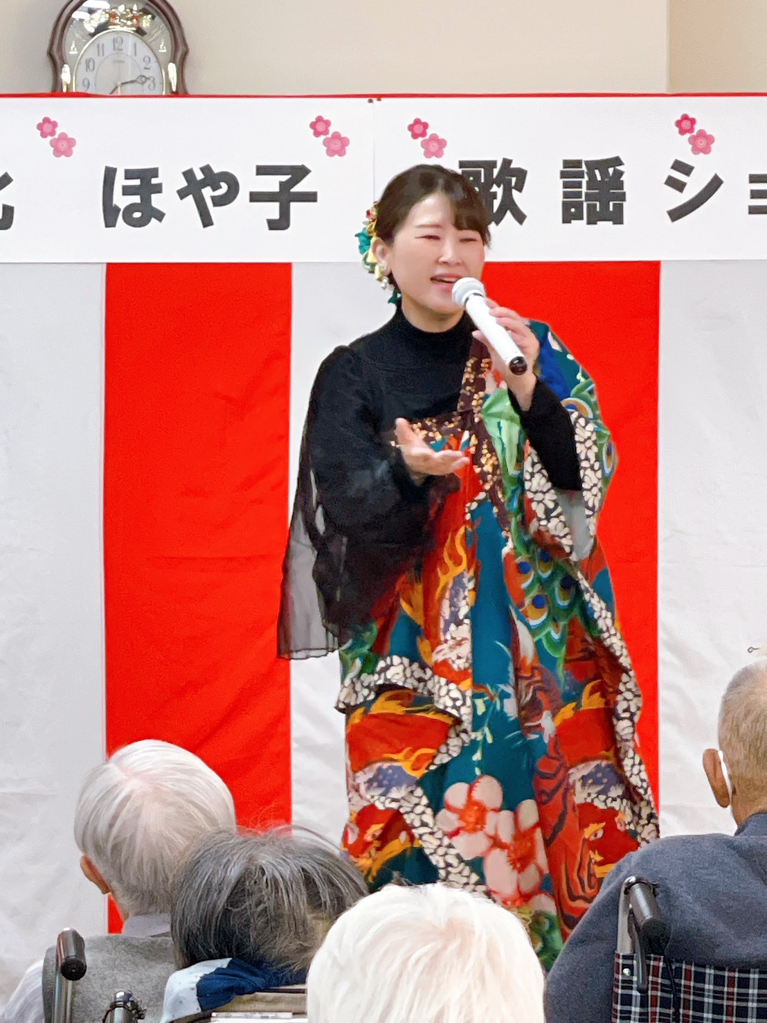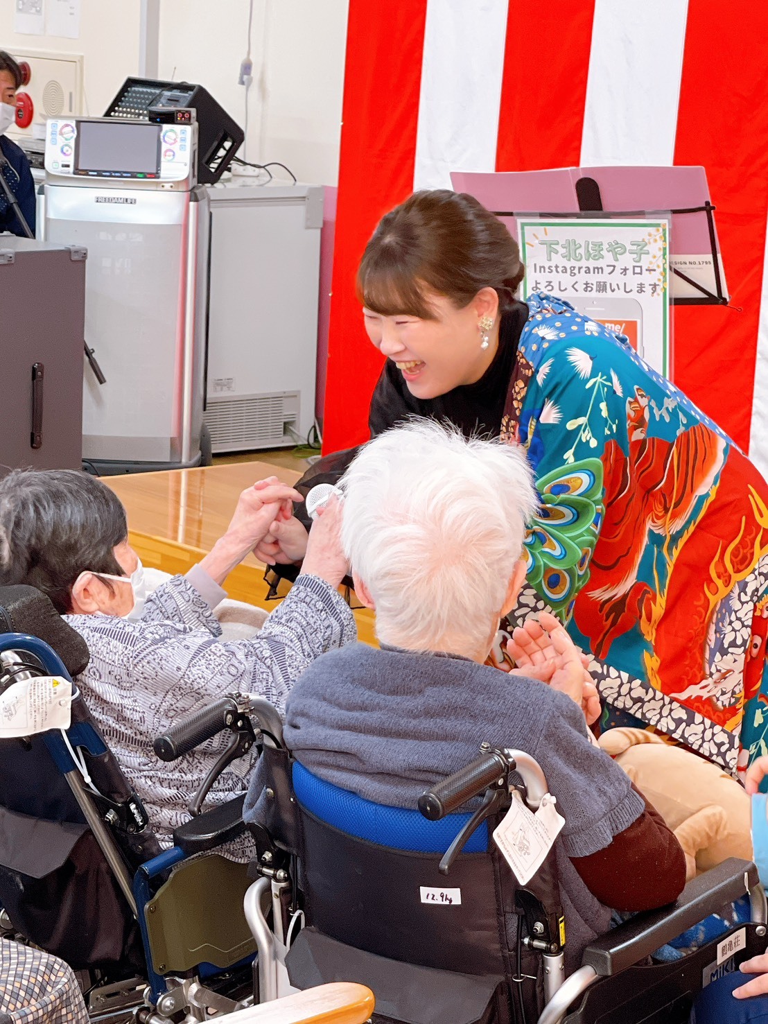 懐かしの昭和のメロディーを美しい歌声で歌ってくださり、みなさん大喜び😊 MCも大変お上手で恋愛の大先輩である入所者様に恋のアドバイスを求めてみたり?!